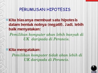 Bab 1 pengenalan terhadap statistik. Data dikotomi merupakan data yang bersifat pilah satu sama lain misalnya suku agama jenis kelamin pendidikan dan lain sebagainya. Hipotesis statistik yaitu suatu pernyataan atau dugaan yang belum terbukti mengenai suatu populasi dalam penelitian yang dinyatakan dengan angka-angka statistik.